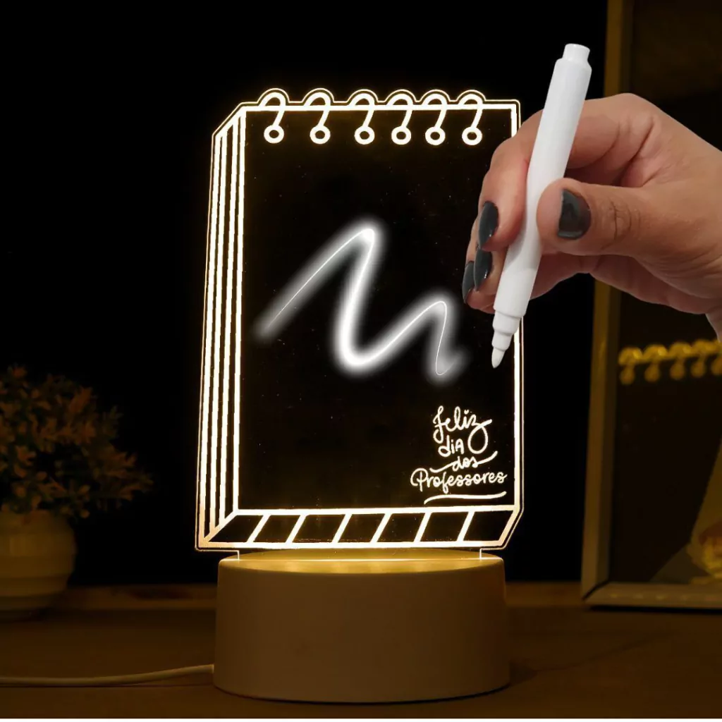 Esse efeito visual se torna possível devido a luz de led acoplada em sua base que é projetada sobre o desenho de acrílico transformando-a em um objeto iluminado.
