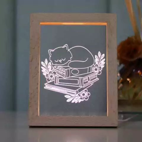 1. Base porta retrato em madeira com luz de led embutido e cabo USB acoplado.