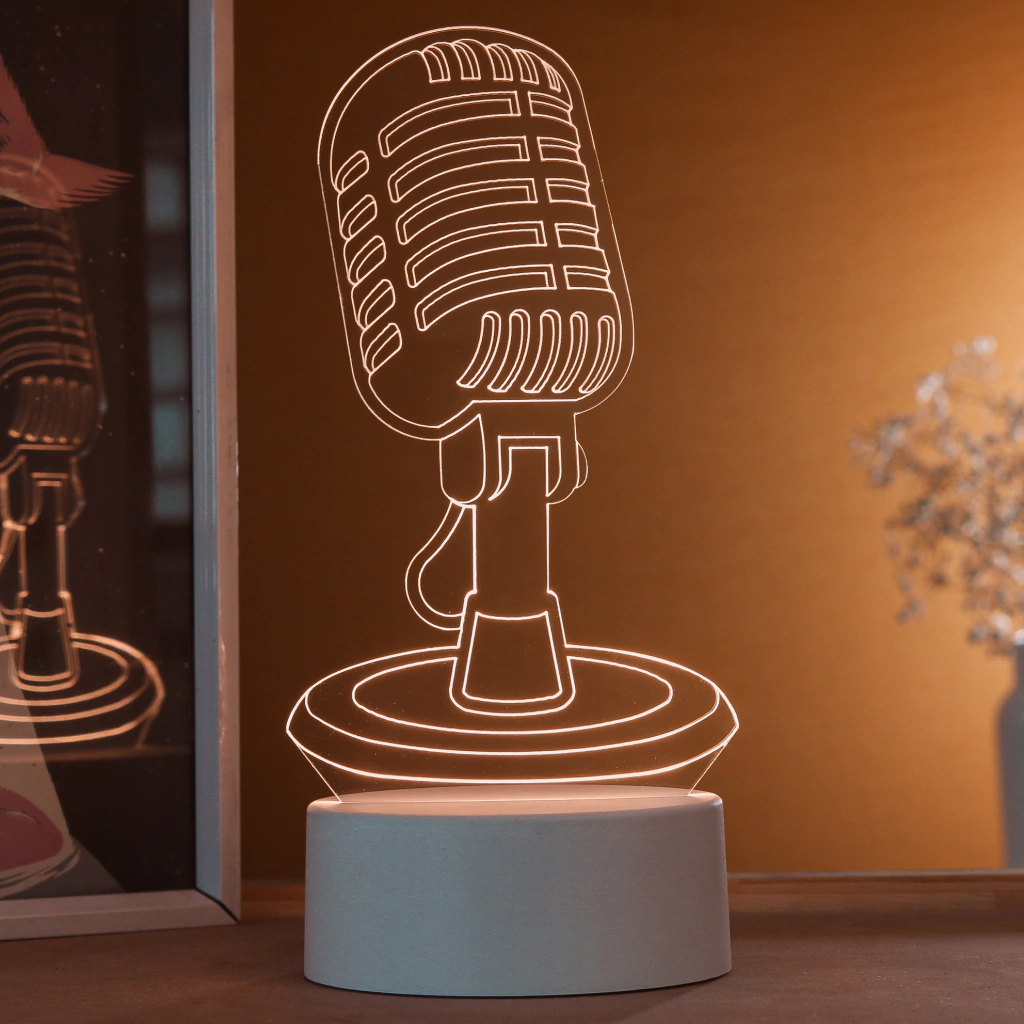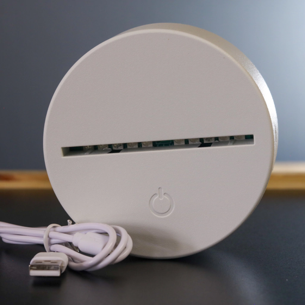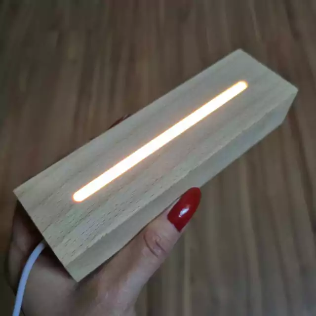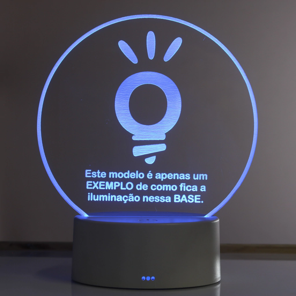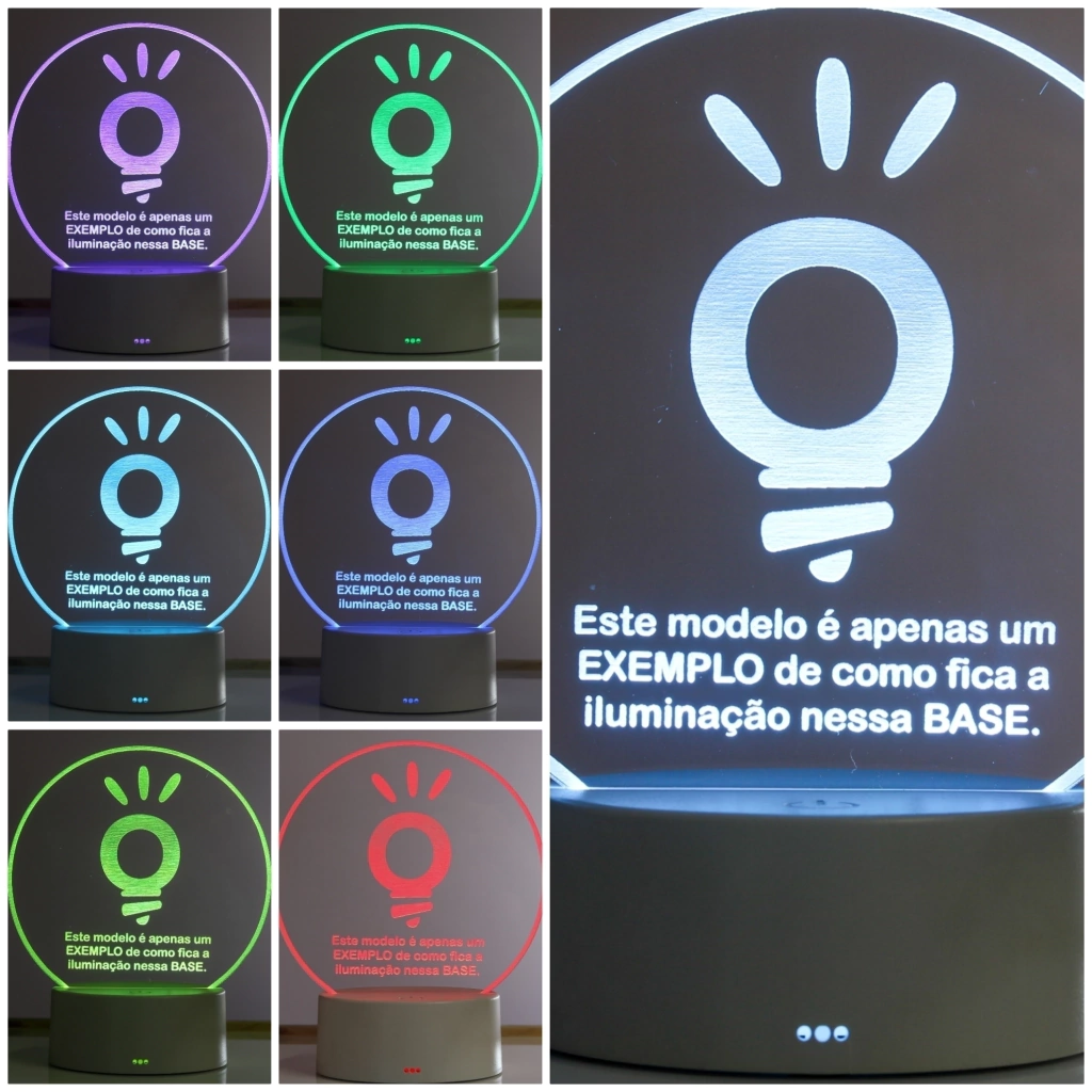 Esse efeito visual se torna possível devido a luz de led acoplada em sua base que é projetada sobre o desenho de acrílico transformando-a em um objeto iluminado.